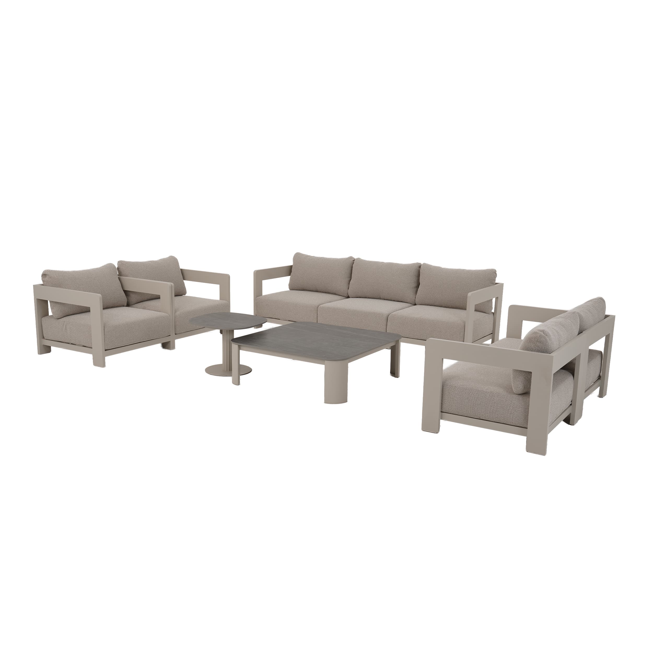 Základem soupravy je práškově lakovaná hliníková konstrukce, která je lehká, pevná a vysoce odolná vůči povětrnostním vlivům, UV záření i korozi. Je ideální pro celoroční venkovní použití bez náročné údržby.