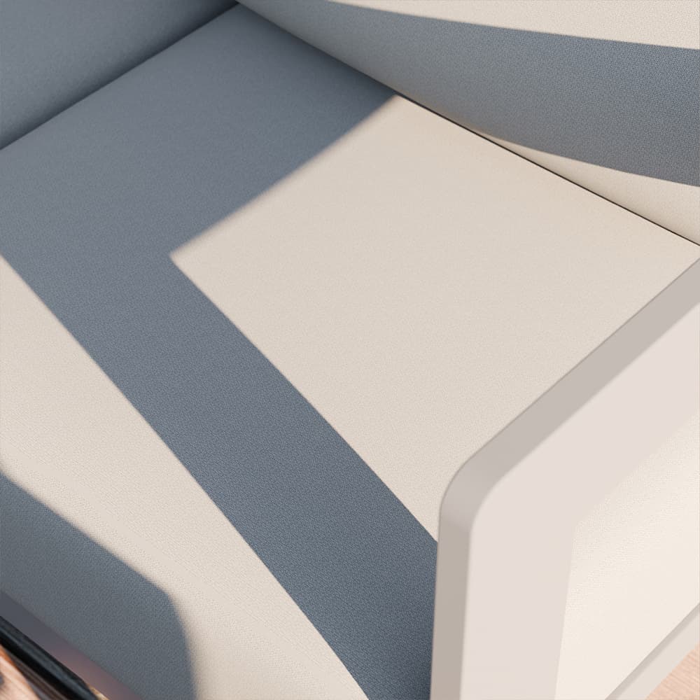 Polštáře: voděodolná yarn-dyed látka, se zipem (Yarn-dyed látka znamená, že jsou vlákna barvena ještě před tkaním. Díky tomu si polštáře dlouhodobě udrží svou barvu, neblednou na slunci a vypadají stále jako nové. Látka je zároveň odolná vůči vlhkosti a příjemná na dotek)