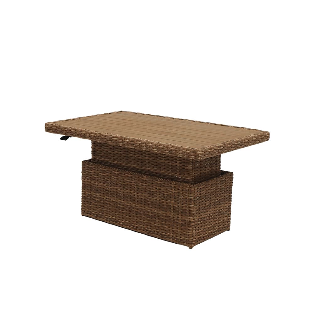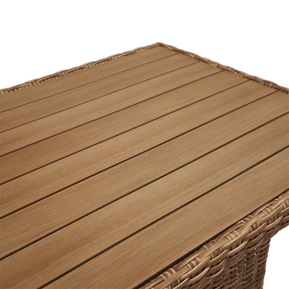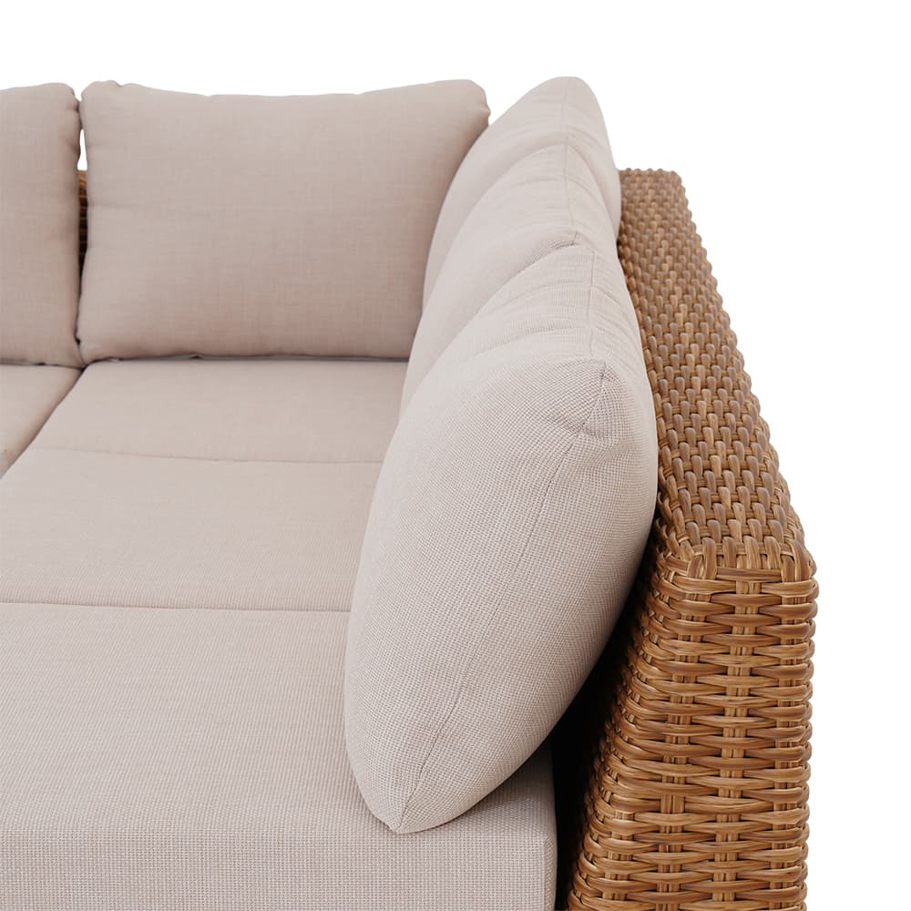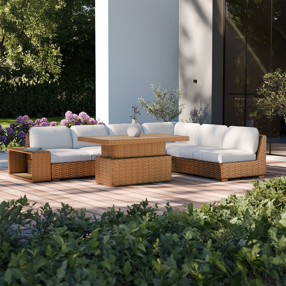 Lehká, ale pevná hliníková konstrukce povrchové úpravy připomínající přírodní ratan vytváří elegantní a zároveň útulný prostor pro relaxaci. Souprava je odolná vůči povětrnostním vlivům i UV záření, takže si zachovává svůj vzhled i při dlouhodobém používání venku.